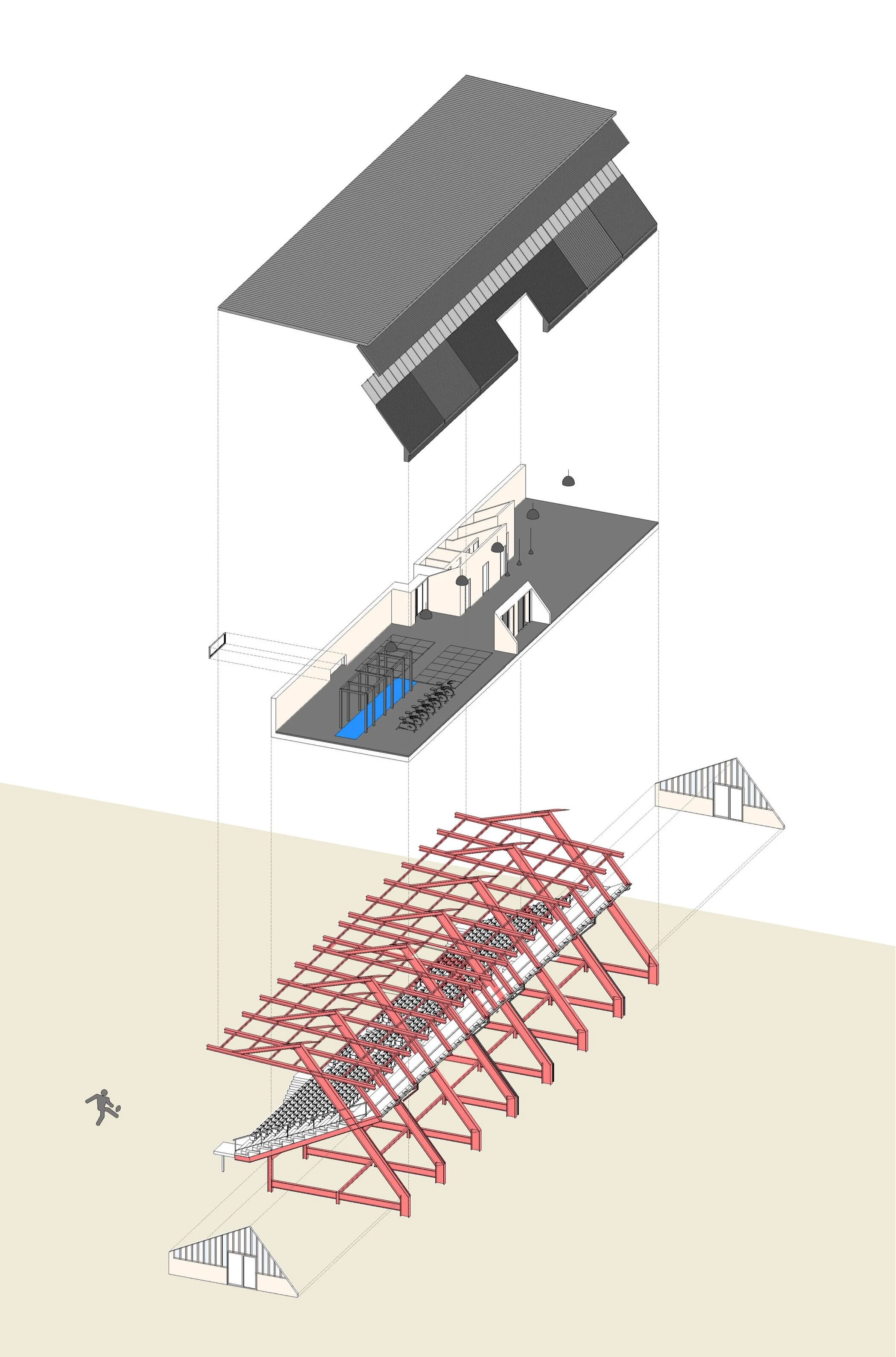 Externally, the whole structure is sheathed in bitumen corrugated roofing whilst all internal walls are clad voluminously in economical plywood, emphasising the rhythmical kit-part host structure. The tectonics of the sports equipment and exposed services add a final layer to the architectural anatomy of the internal environment ensuring a raw, robust and uncompromising aesthetic. The project relied heavily upon sheet materials, economies of scale and deliverability by local contractors. A distinct entry is carved into the extrusion and contributes to the natural ventilation strategy.