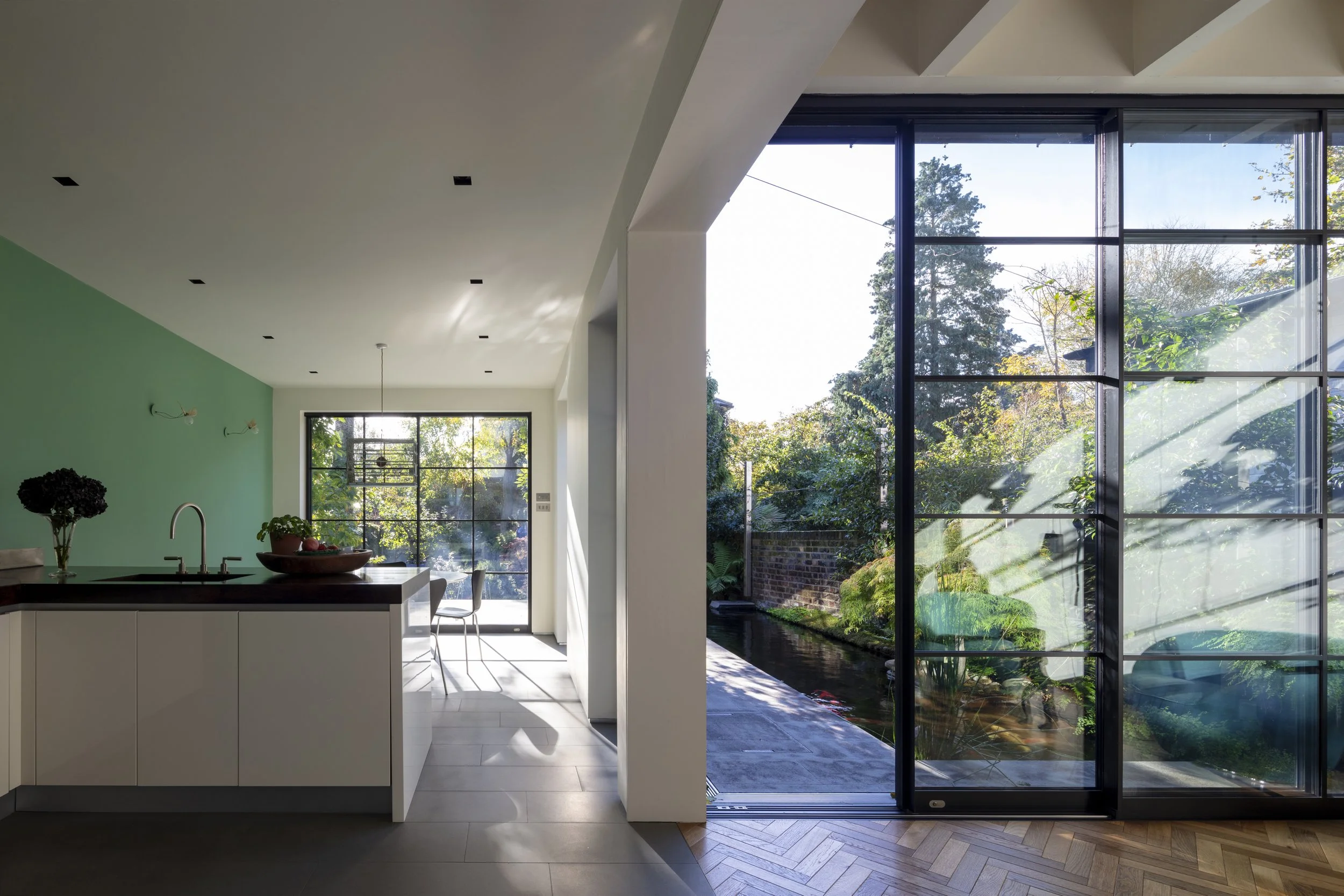 An attractive historic villa has been remodelled and extended at ground floor with a flexible series of living and working spaces associated to bold, client led Koi carp fish ponds, stepped landscaping and impressive lush garden.