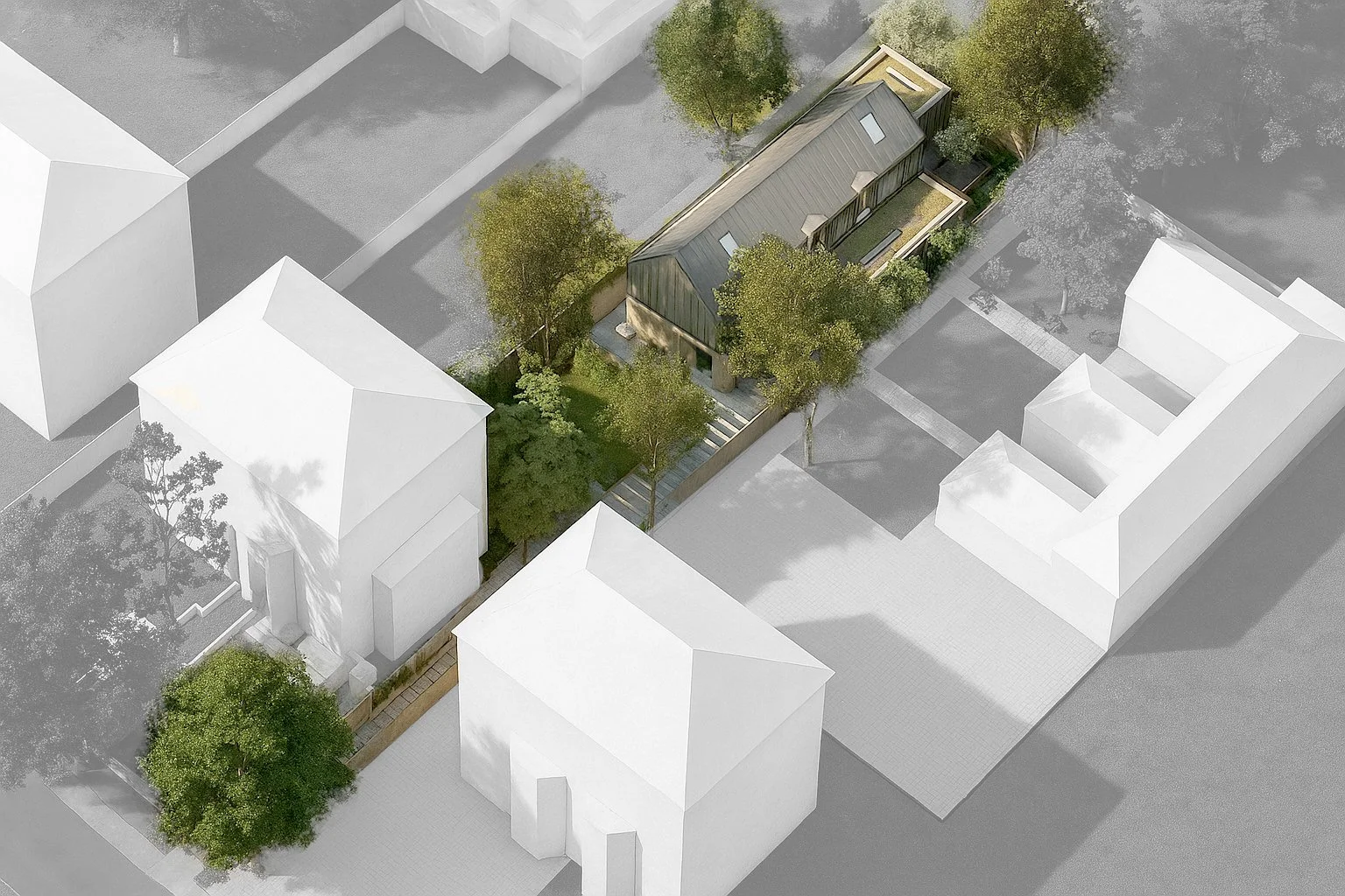 The composition of the plan and architecture is informed principally by the existing trees, resulting in three distinct brickwork forms projecting below the simple pitched zinc upper floor. Articulated brickwork - terminating in a vertical stretcher band - creates a sense of mass, with the lightweight standing seam zinc above, which also acts as a complimentary material. The roof is punctuated by dormer windows with splayed reveals and detailed with a neat and lightweight leading edge. Inherent in the architectural design, the form and composition seek to direct views, limit overlooking and provide passive shading opportunities to occupants. As such, the environmental credentials of the scheme are in part inherent in the architecture but complimented by an air source heat pump, solar PV panels and passive ventilation strategies.