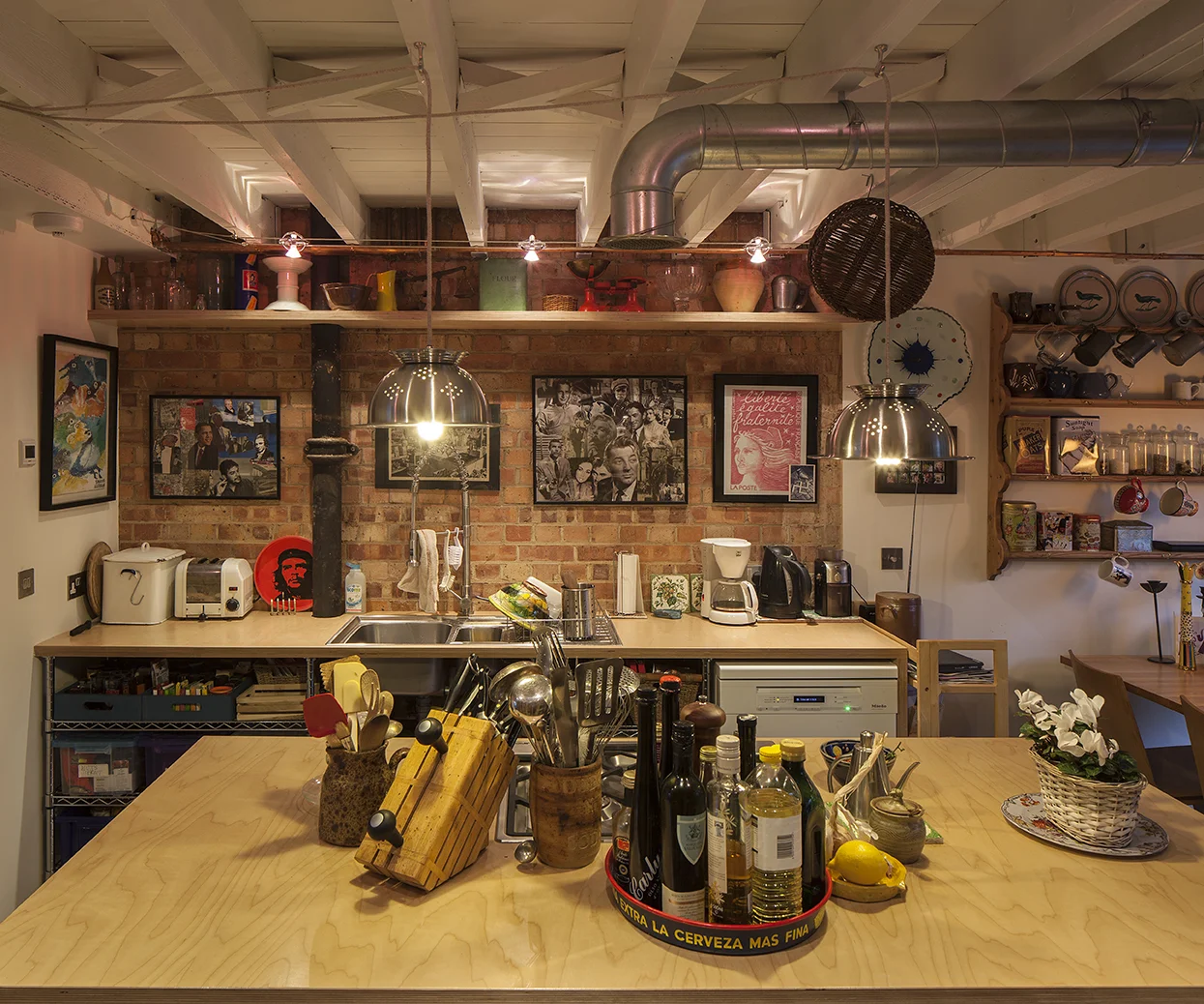 A series of plywood interventions amongst lovingly cluttered photographs, prints and eclectic furniture populate this reorganised 1960s span house. Exposed ceiling rafters, polished concrete floors, bespoke staircase design, reeded glass panels, cork floors and crafted plywood joinery all contribute to an overarching aesthetic. The three storey property is linked by a sculptural stair of lacquered ply and waxed mild steel risers as the centrepiece connecting all three levels. A yellow feature wall extends as a backdrop to the staircase from ground to second floor. The schematics included a ground floor garage conversion and rearrangement of the kitchen, dining and living spaces in order to provide an extra study area and additional bedroom upstairs. Carefully selected lighting, mechanical fittings and bespoke glazing joinery come together, forming a bold interior identity. Our client has furnished the home with a collection of modernist furniture, carpets, paintings and fittings.