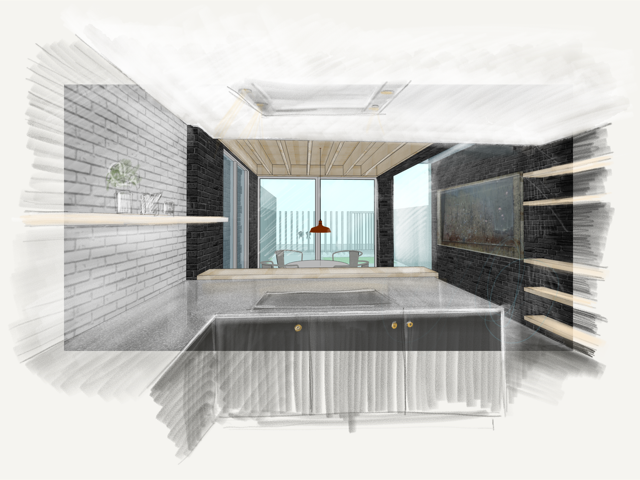The new extension, and significant internal refurbishment is bold in its execution of materials and finishes; within a sensitive architectural addition. Terrazzo floor tiles, black brickwork and stained roof joists, in combination, contribute to an overarching aesthetic. As the property is an end of terrace, side light was able to be utilised through a brick jali and a wrap over glass skylight pulled light further into the plan. The brickwork was extended into the garden, and uniquely landscaped by Stefano Marinaz. At first floor, the home has been adjusted in order to focus key spaces over the back garden, overlooking the intensive green roof on the new extension. Our client has furnished the home with a collection of contemporary art, which further complements the home.