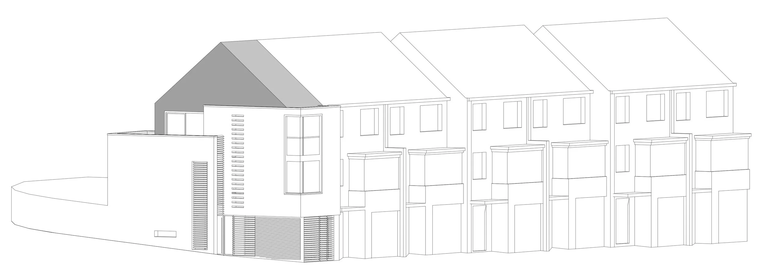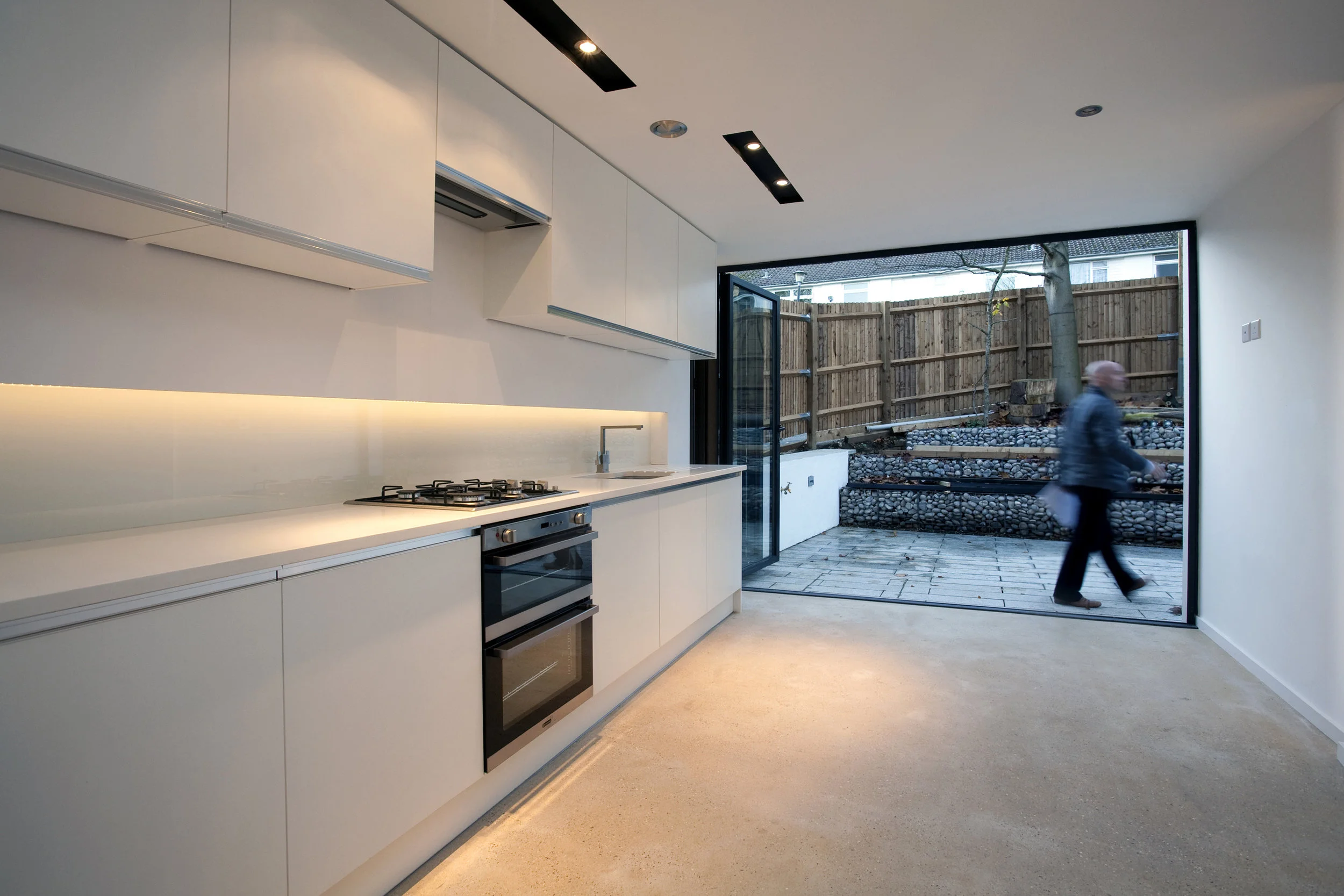 This new build, three storey, 120sqm two bedroom home in Wimbledon became an exercise in compact architecture and an investigation into contextualised aesthetics within existing street scenes. Located on a very tight end of terrace site, the home fits in with the scale of the adjacent 1960s terrace. The triple fronted, sloping site varies from 3-4.5m wide from front to back respectively and included large trees with preservation orders.