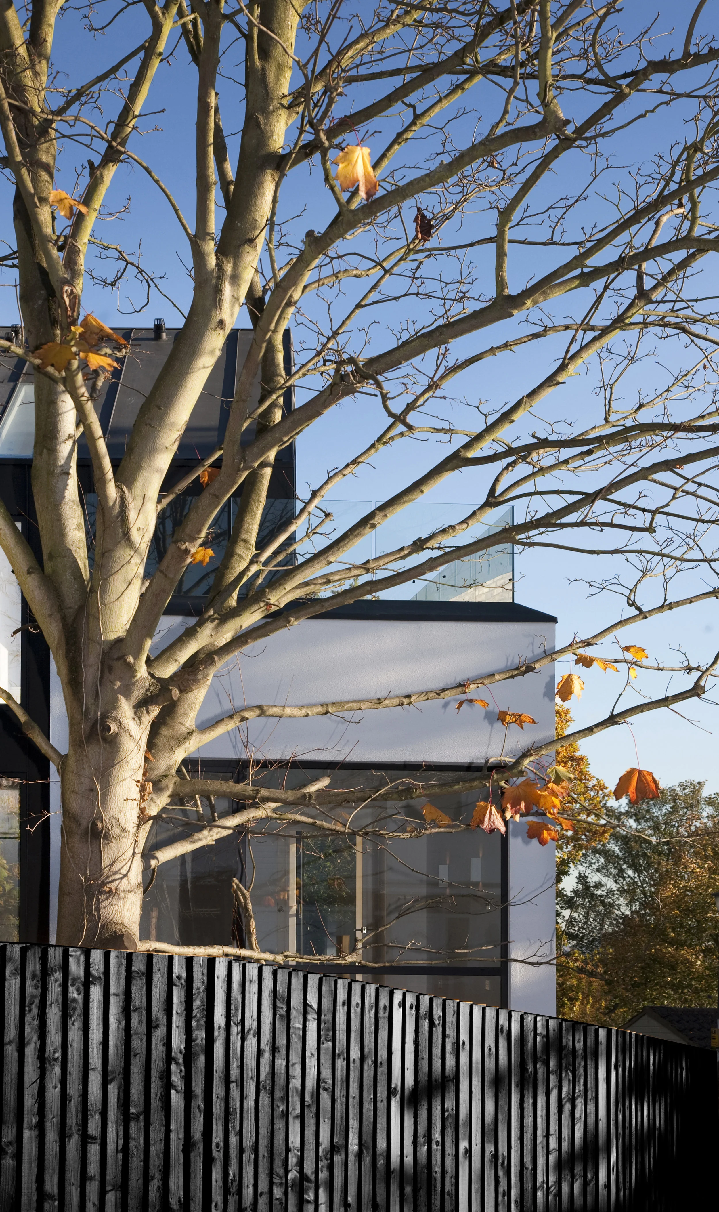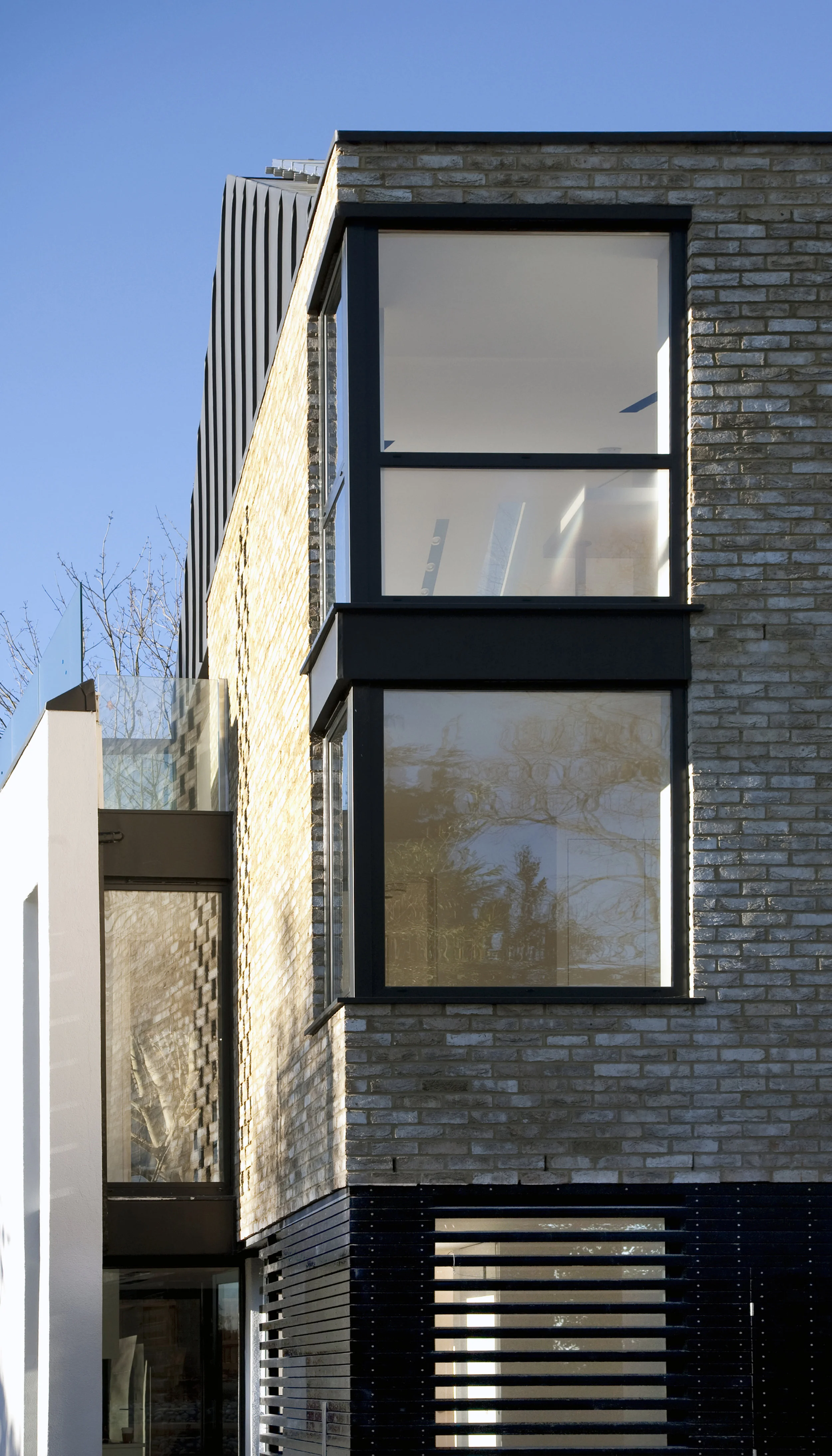 The architecture responded accordingly, where the wrapping and layering of walls created a sophisticated composition and helped to break down the overall massing. The scheme is a composition of alternating volumes constructed of black larch wood, white render, grey zinc and perforated stock brick. The house is designed with the main living spaces and roof terrace on the upper most floors, taking in the best of the southern sun and long distance views towards London.