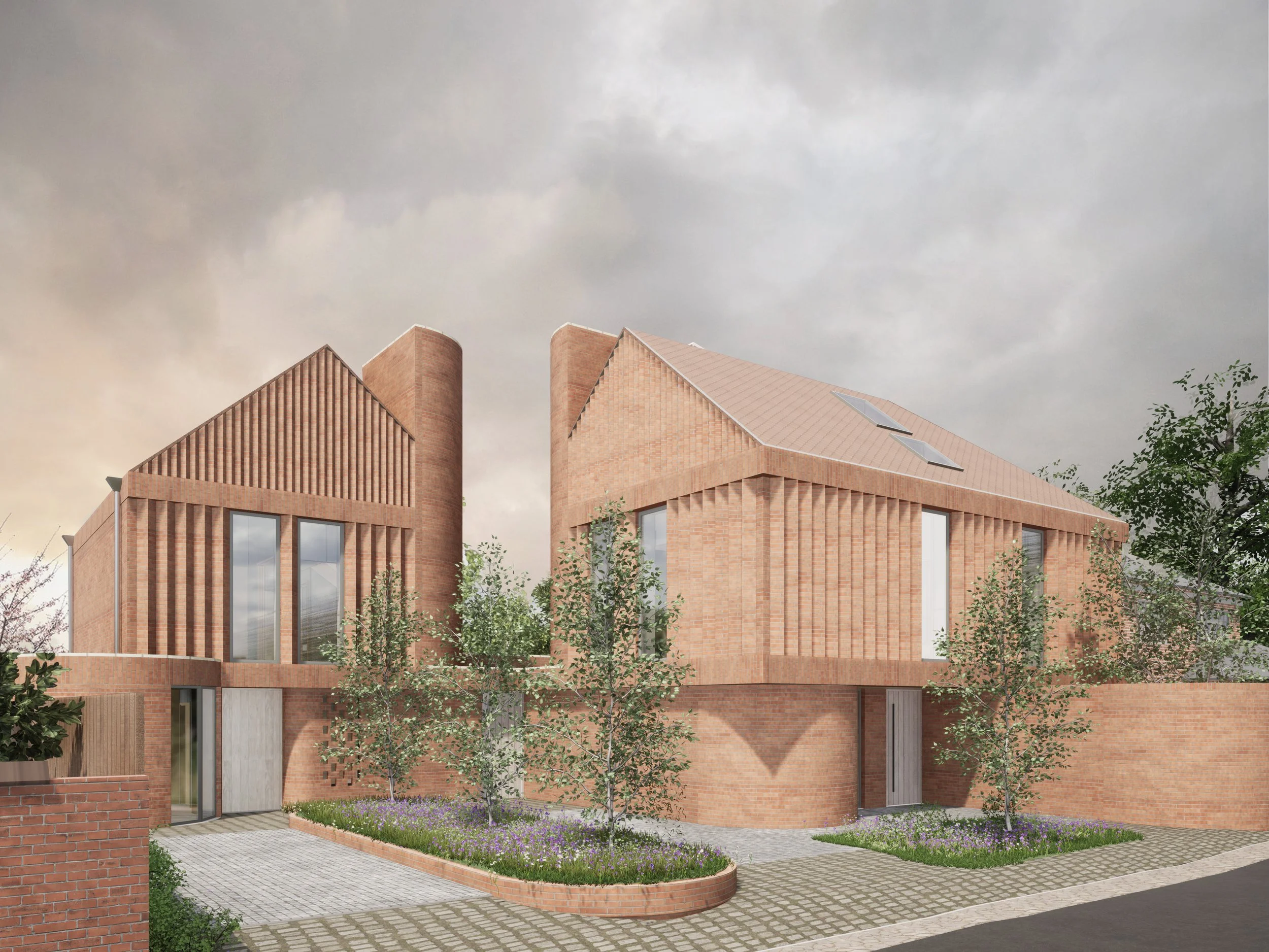 Tucked away down a small lane, two new homes located within a conservation area have been conceived as one overall composition. The detailing and pattern making within the facing elevations draws much inspiration from the enduring architecture found in the vicinity. The asymmetrical composition, accentuated gables and prominent chimney stacks are key elements of wider architecture; abstracted and interpreted in a contemporary manner using traditional materials and detailing. The ground floor takes on curving elements and a solider course plinth runs across the width of the two homes before giving way to two gauges of patterned brickwork at first and second floor. Curving chimneys and colour matched tiling complete the overall vision.