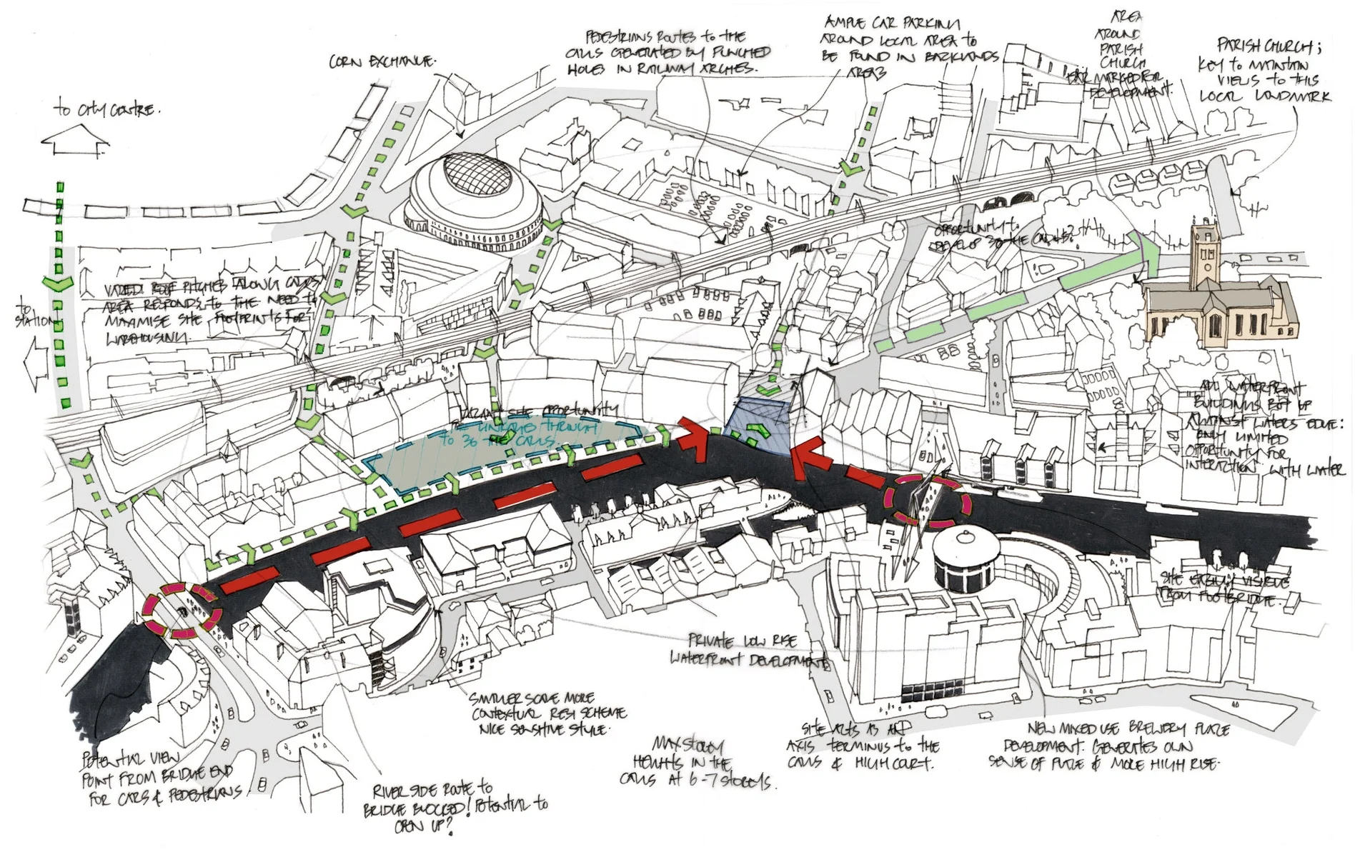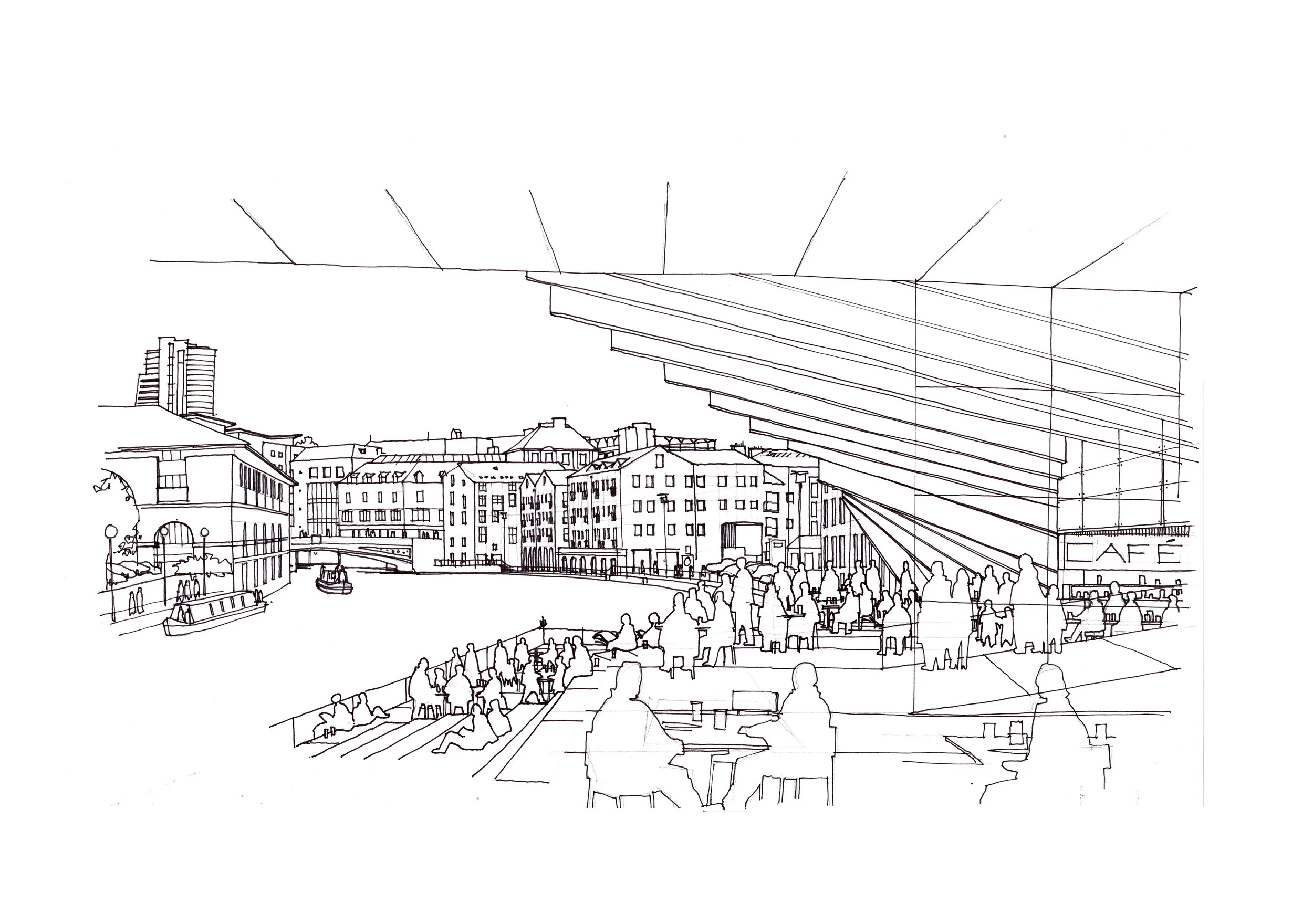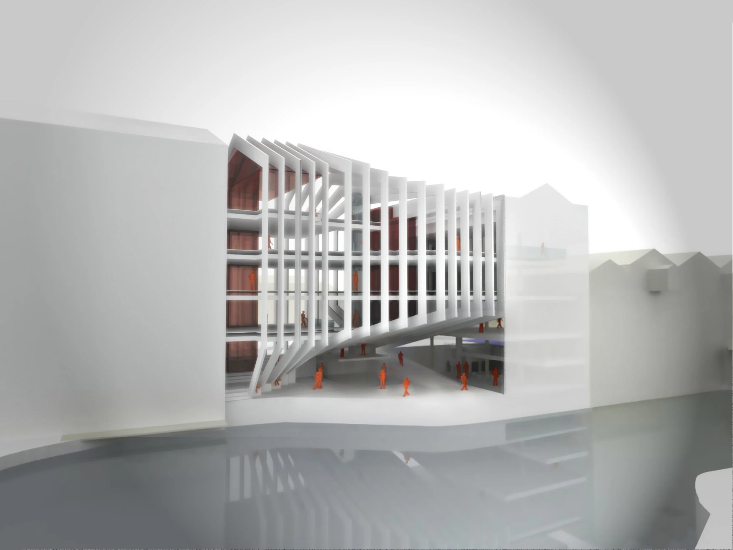 'This delicate rib cage of a building was the judges' unanimous winner. The proposals aim to repair the historic urban fabric. A large sloping underside provides cover for the riverside public area beneath.'