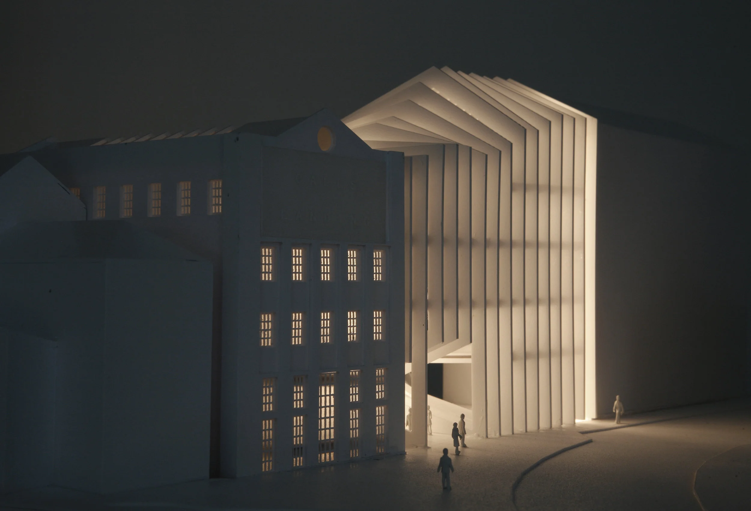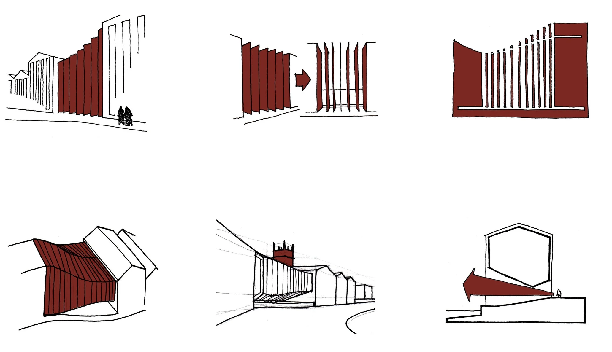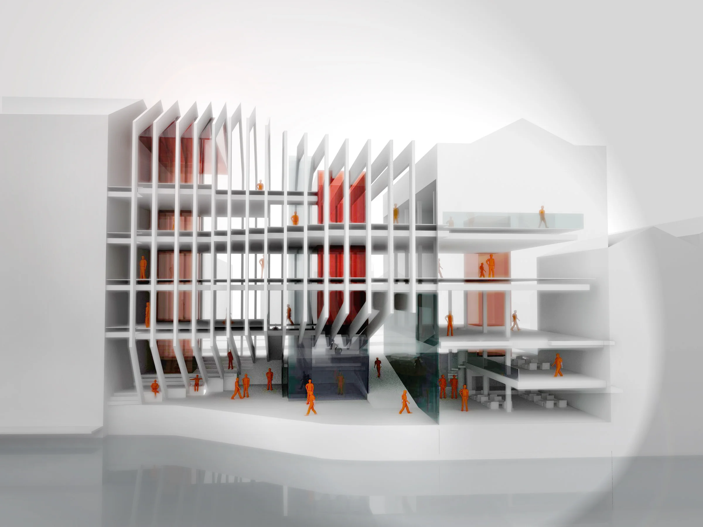 'This delicate rib cage of a building was the judges' unanimous winner. The proposals aim to repair the historic urban fabric. A large sloping underside provides cover for the riverside public area beneath.'