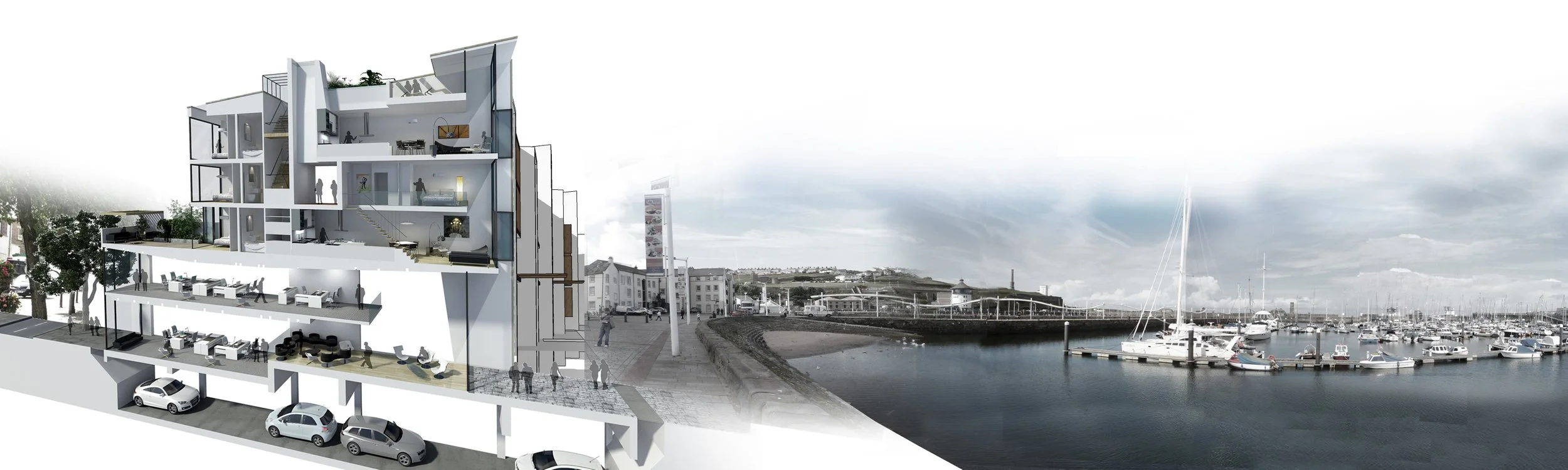 The historic urban block pattern and continual frontage is reinstated onto Strand Street and the Quayside by virtue of the office floor plate which runs the full length and depth of the site on the ground and first floors. This floor plate is punctuated by a new pedestrian link that holds the memory of the former Mark Lane, purpose and activity to this new link is delivered by locating the main entrances of the office space along this route. The proposals set out to provide desirable residential accommodation, accessible and effective commercial business space and a memorable back drop to the harbour and community activities throughout the year providing a unique slice of town, hill and sea views.