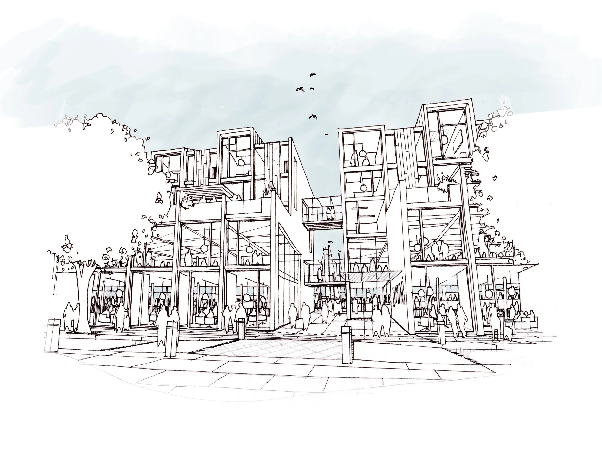 The proposals aim to provide an interface between the harbour, town centre and community along the length of the quayside. The design combines function and materiality within an extremely deliverable and efficient layout. The building programme is divided vertically in section with B1 office and public facilities interfacing with the street and quayside at ground / first floor levels and within the renovated former Bath House. The upper three floors comprise the residential accommodation which affords glorious far reaching views. At basement level an efficient double banked fully secured, naturally ventilated car park layout with provision for cycle storage, refuse and plant is discretely accessed from Strand Street.